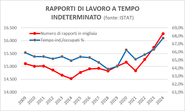 Anche l’andamento del numero dei contratti a tempo indeterminato non conferma un aumento della precarizzazione. Essi infatti hanno visto nello scorso decennio un consistente incremento sia in termini assoluti sia in termini percentuali sul numero degli occupati anche dopo la fine delle facilitazioni contributive straordinarie concesse dalle Leggi di Stabilità nel primo biennio dall’introduzione del Jobs Act e con una sensibile accelerazione a partire dal 2021.