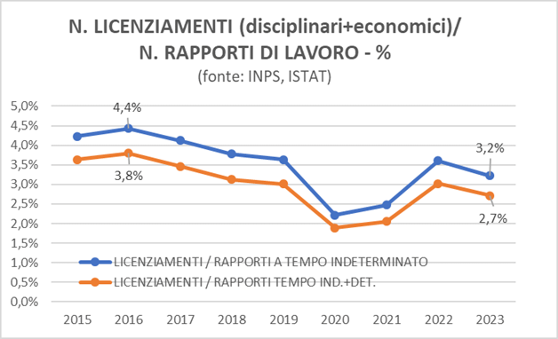 Innanzitutto i licenziamenti non hanno evidenziato gli incrementi che alcuni si sarebbero attesi: la loro statistica mostra una riduzione in termini assoluti (da 624mila nel 2015 a 507mila nel 2023) e del loro rapporto percentuale sul numero dei contratti di lavoro in essere. Come il grafico seguente mostra, tale rapporto evidenzia nel 2023 valori inferiori di più di un quarto rispetto al picco del 2016 – i dati del biennio 2020-21 sono anomali perché influenzati da provvedimenti straordinari al tempo della pandemia.