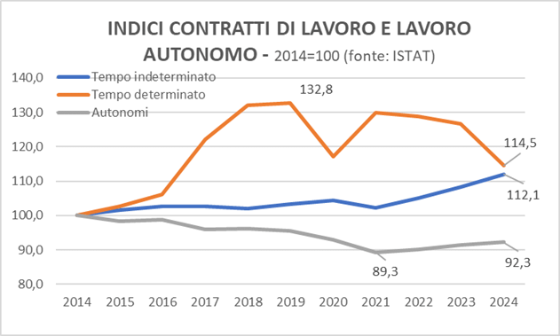 I rapporti a tempo determinato presentano anch’essi dall’introduzione del Jobs Act una crescita come mostra il grafico seguente, con un’autentica esplosione nel triennio 2017-19. A partire da tale data tuttavia, probabile riflesso della maggiore accettazione dei contratti a tempo indeterminato l’ indice del loro numero in essere (su base 2014 = 100) si è ridotto in modo consistente a partire dal 2019, ovvero da 132,8 a 114,5 negli ultimi cinque anni riducendosi a un livello quasi pari a quello dei contratti a tempo indeterminato.